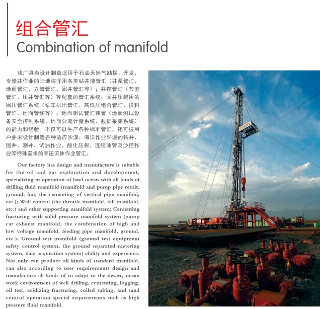 مصنعنا لديه تصميم وتصنيع مناسب للتنقيب عن النفط والغاز وتطويرهما، وهو متخصص في تشغيل المحيطات البرية بجميع أنواع مشعب سوائل الحفر (المشعب وأنابيب المضخة المحولة، هوي، تدعيم مشعب الأنابيب العمودي وما إلى ذلك)؛ التحكم الجيد (مشعب الخانق، مشعب القتل وما إلى ذلك) ونظام المشعب الداعم الآخر؛ تكسير الأسمنت باستخدام نظام مشعب الضغط الصلب (مشعب عادم السيارة، مزيج من مشعب الجهد العالي والمنخفض، مشعب أنابيب التغذية، الأرض وما إلى ذلك)؛ مشعب الاختبار الأرضي (نظام التحكم في سلامة معدات الاختبار الأرضي، نظام القياس المنفصل عن الأرض، نظام الحصول على البيانات) القدرة والخبرة لا يمكن فقط إنتاج جميع أنواع المشعب القياسية، بل يمكن أيضًا وفقًا لمتطلبات المستخدم تصميم وتصنيع جميع الأنواع للتكيف مع الصحراء وبيئة العمل البحري للبئر الحفر، التدعيم، قطع الأشجار. اختبار الزيت، التكسير المحمض، الأنابيب الملتفة، وعمليات التحكم بالرمل، متطلبات خاصة مثل مشعب السوائل عالي الضغط.